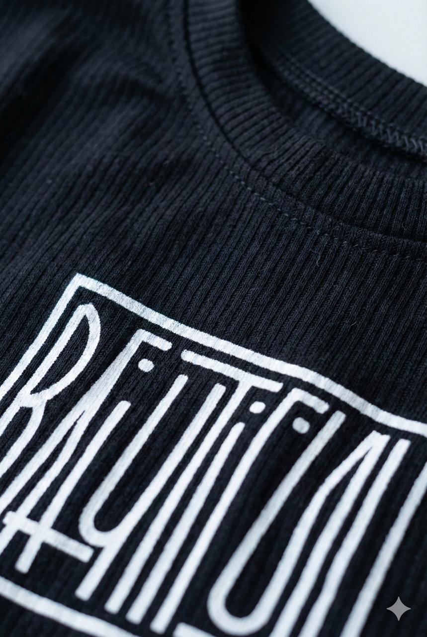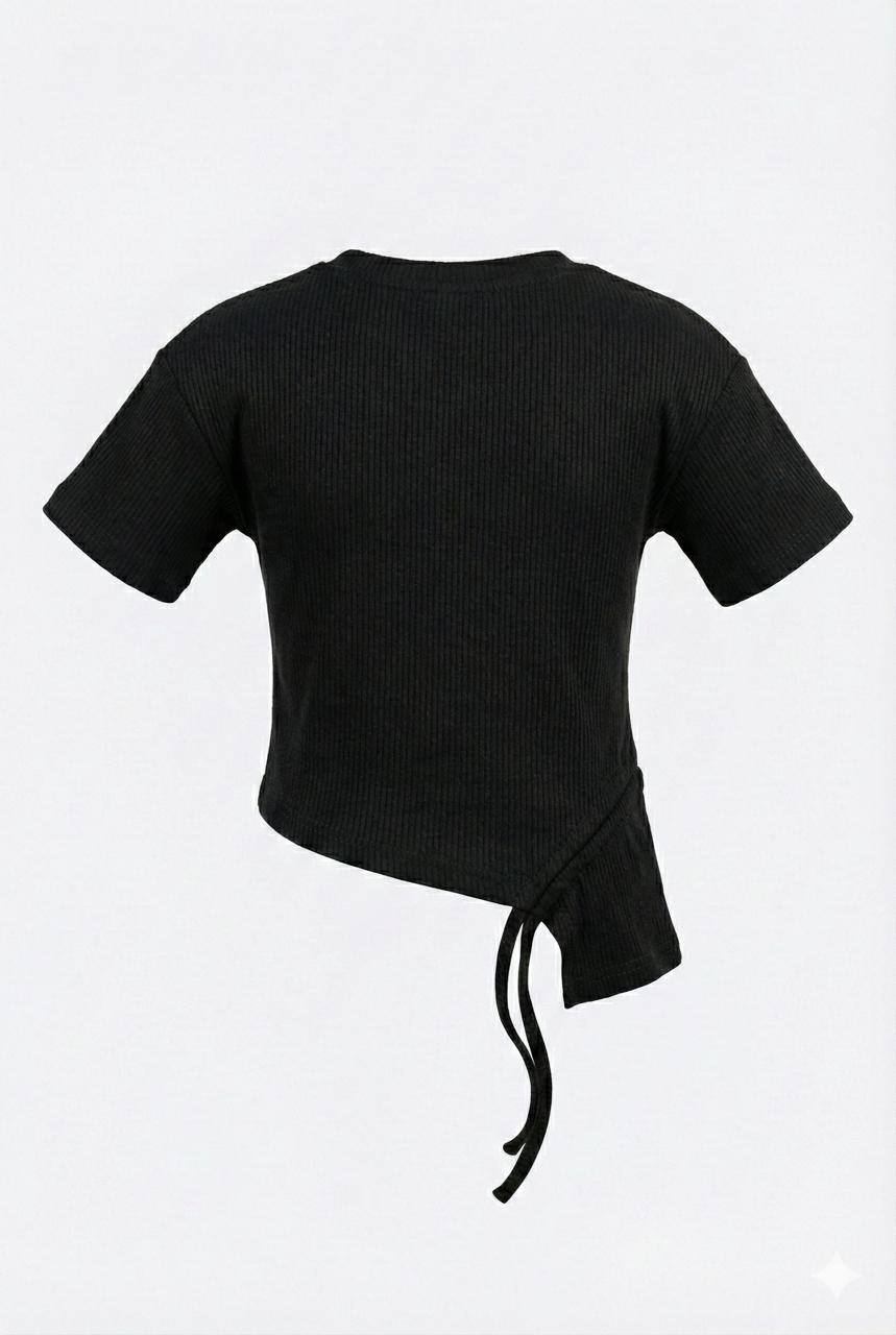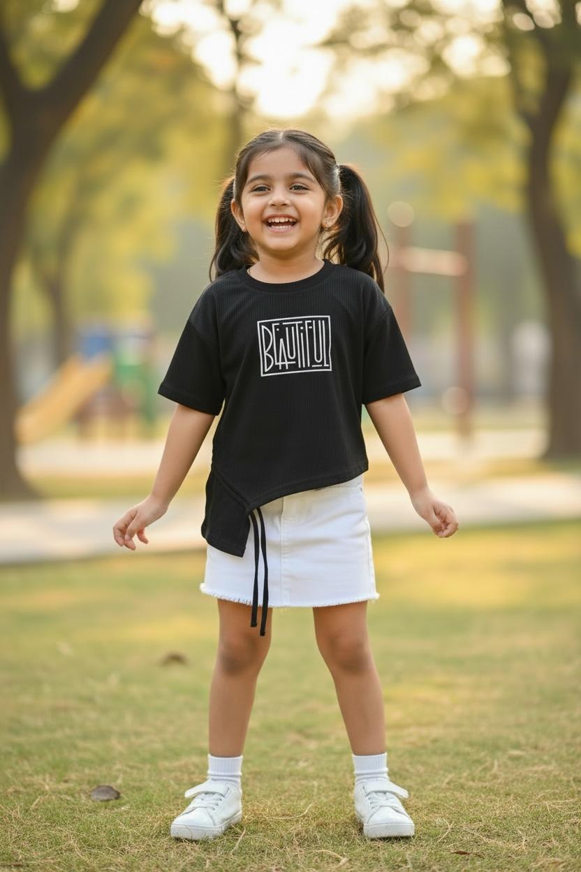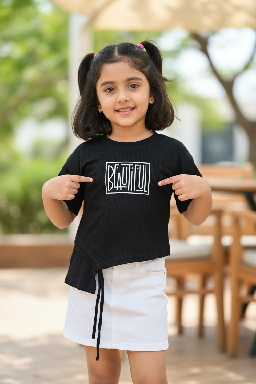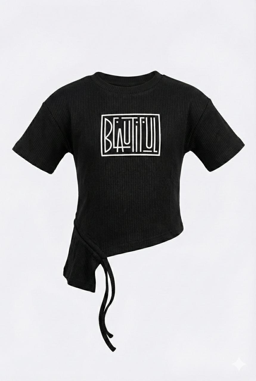 This stylish black ribbed top brings a modern edge to everyday kidswear. Designed with an asymmetrical hem and adjustable side tie-up, it adds a trendy silhouette while staying comfortable for all-day wear. The bold “Beautiful” graphic print on the front gives a confident, feel-good vibe. Crafted from soft ribbed fabric, this top pairs effortlessly with jeans, skirts, or shorts for a chic casual look.