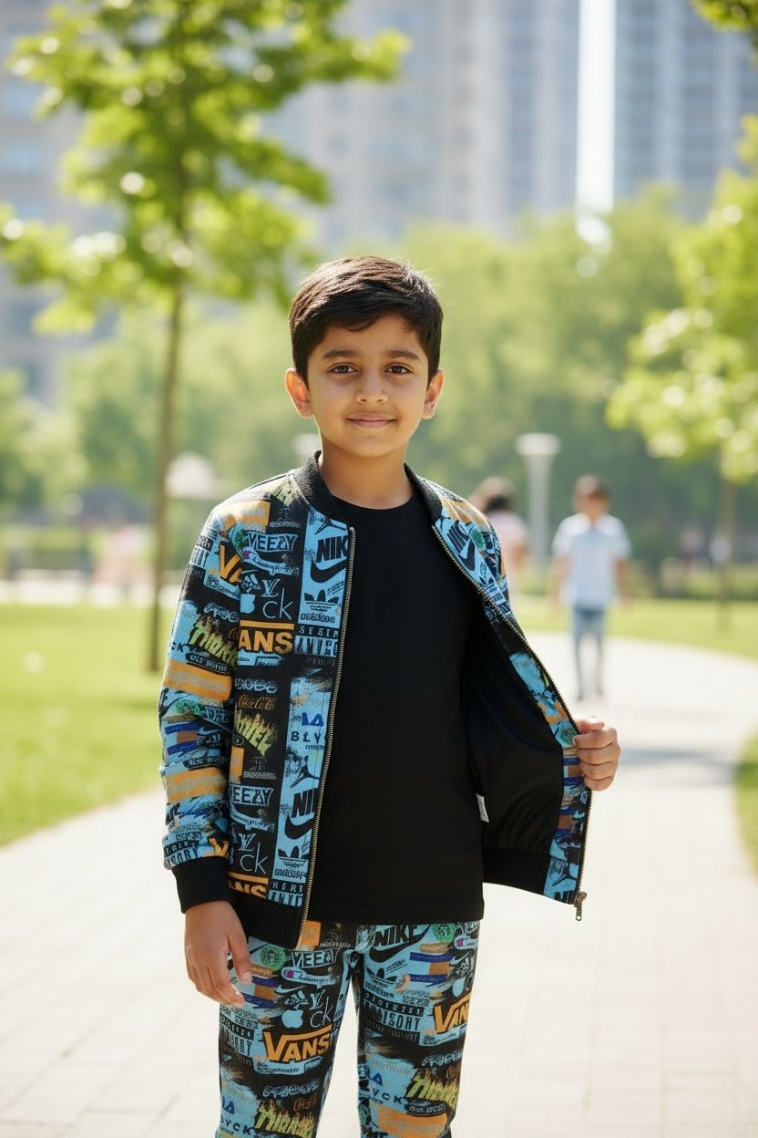 This boys’ printed winter tracksuit set features a full-zip jacket paired with matching jogger pants. Designed with an all-over graphic print, it delivers a stylish streetwear vibe while ensuring comfort and warmth.