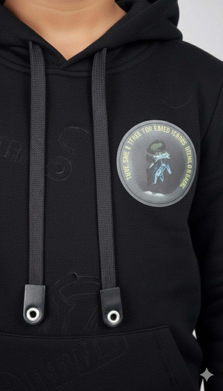 Give your boy the perfect blend of style and comfort with this all-black premium winter co-ord set. Designed with a sleek hoodie featuring bold drawstrings and a trendy chest badge, paired with matching joggers for a clean, sporty silhouette. Soft fleece lining keeps him warm, while the modern fit makes it perfect for everyday wear, outings, travel, and winter style moments.