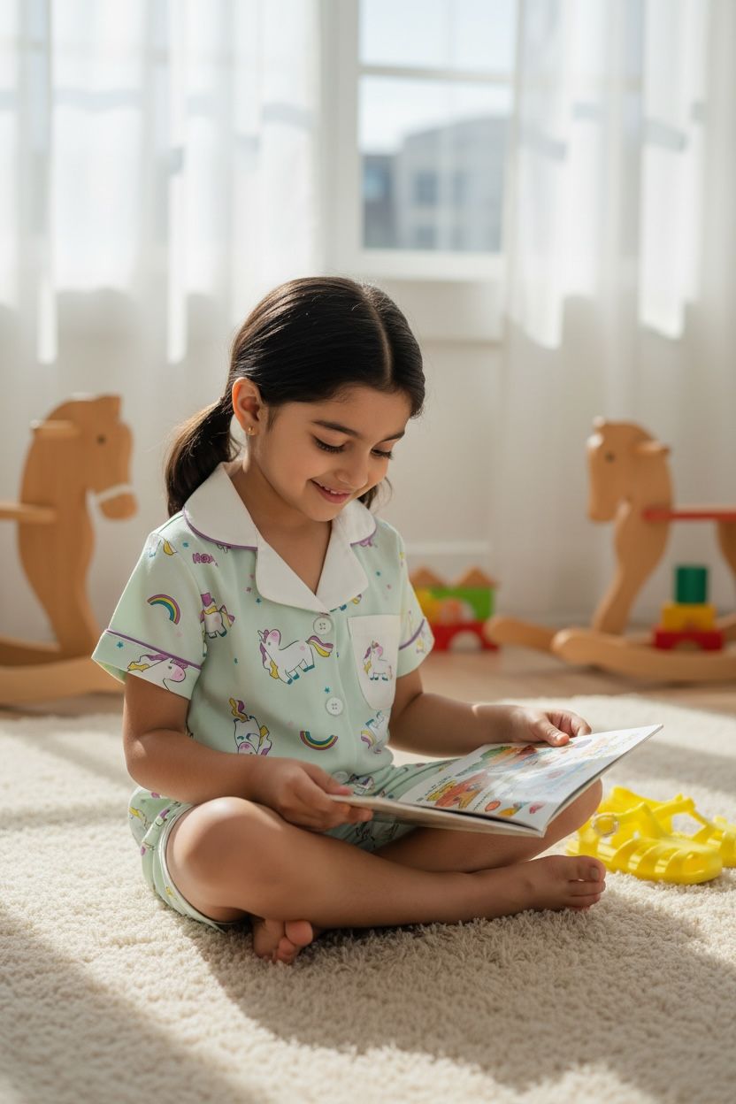 Make bedtime fun and comfortable with this adorable unicorn printed night suit set. Crafted from soft, breathable cotton, this set includes a short-sleeve button-down shirt and matching elastic-waist shorts. The playful all-over print adds a cheerful vibe, while the relaxed fit ensures maximum comfort for peaceful sleep and cozy lounging.