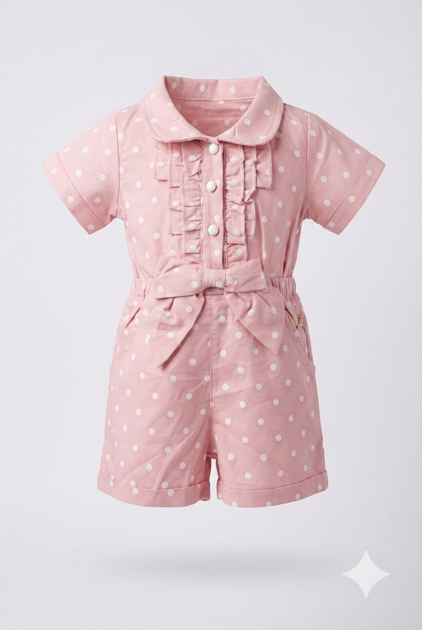 This girls’ pink polka dot jumpsuit is crafted from soft stretchable cotton for all-day comfort. Featuring a classic collar, front button detailing, and a matching waist bow, it creates a polished yet playful look.